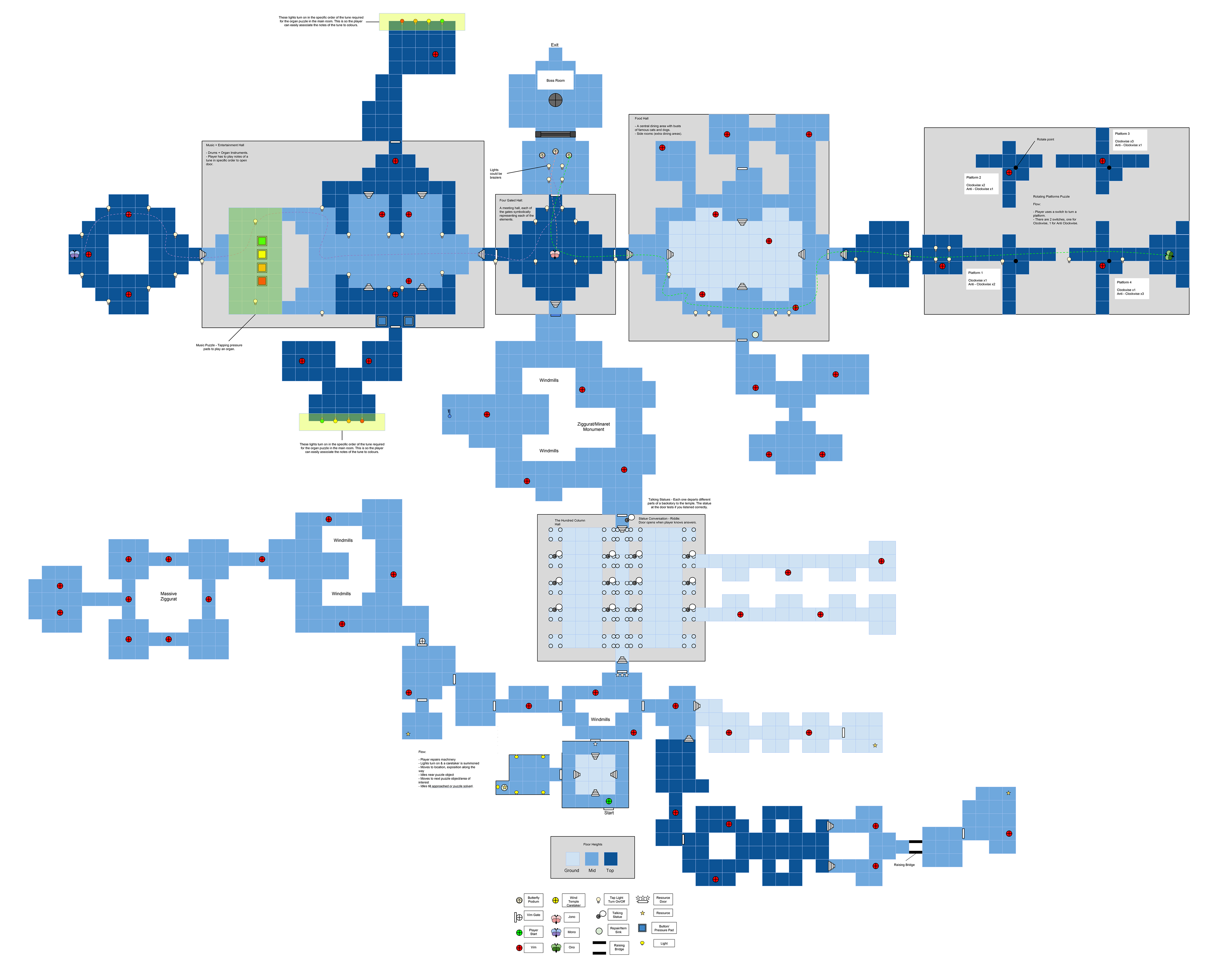 I based this temple design around three guardians the player must set free and bring back to a central point. Rescuing the guardians opens a central door which leads to the boss fight for this particular temple. The puzzles in the temple are based around rotating platforms, and a song the player needs to remember the order of notes for, similar to ‘Simon says’ style gameplay. Zoom in on the image to see the puzzle explanations and their solutions.
